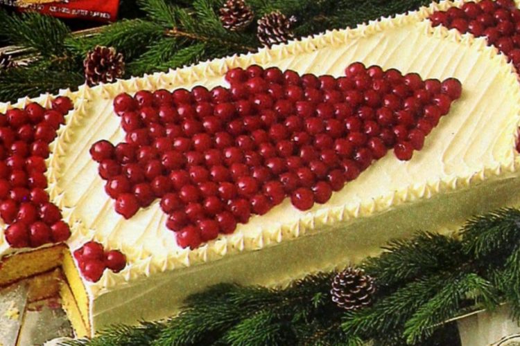 Cherry Christmas tree cake vintage dessert recipe (1986) Click Americana